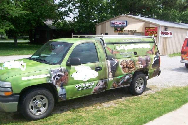 Pulling traps out of trucks, bringing wildlife in traps back to truck, taking traps up and down ladders...sorta figured neighbors would have an idea what we were doing at home with or without lettering on trucks. True! And I'd rather the neighbors know it's a licensed, insured, and trained company handling the job rather than the customer's brother-in-law, Billy Bob, who just picked up a couple traps at HD. I handed out SIX business cards during one stop at the end of a cul-de-sac yesterday. Included neighbors and a delivery driver. Will have a built in testimonial from the happy customer who had my fully lettered truck sitting in her driveway. If you are going to letter your truck, the most important surface is the tailgate area. I've had 4 trucks with various amounts and types of lettering, from cheesy magnetic signs on the doors to professionally installed lettering on the sides and/or rear. The one that pays the best dividends is the one with rear door lettering. It scored our first call on the way from the lettering company's location, and the second call within an hour of that. Those two calls paid for the entire lettering job. I regularly get calls for appointments while waiting at stoplights, and have yet to get a call to report my superior driving skills. Agree with Kevin 100%. Having gone through several trucks over the years, when I get a new one the lettering guy is contacted before I even pick it up. I get so many calls from people who saw the truck, I can't imagine why anyone would think the negatives outweigh the positives. On one job several years ago, I had to borrow a truck (non-lettered) due to the job location and circumstances. It was a college campus with a beaver problem on their lake. The beavers chewed down ALL of the 35-year old white birch trees at the apartment complex on the lake, and were plugging the spillway constantly. I was instructed to do the trapping program in 100% stealth mode, as there were five different animal rights groups on the campus. The facilities director said I probably wouldn't have any tires or windows left on my truck if any of them noticed me on the property. You know, those "tolerant, open-minded" college students. I had to drive around the edge of a grassy clearing and hide the unmarked truck behind some pine trees near the shoreline in a brushy area. Removed the entire colony.... no one had a clue. But the other 99% of the time, I park my truck in the most obvious places. Working in large cities like Springfield (IL) I'll make sure I drive IN TOWN instead of using any by-pass routes, as the stoplights and low speed roads are where you pick up the callers for business. Tail-gate is the most noticed "billboard" but sides are also always lettered. No magnets.... permanent signage.... indicates a serious business and not a fly-by-night like you see with roofing companies that storm-chase. Can't say I would ever hire a roofer with magnetic signs on their truck. Just my opinion. (NOT an atttack on Muddawg!) Tailgate shot: Basic, but easy to read and gets to the point.