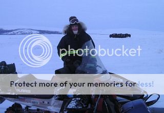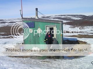 Here she is in front of a shelter cabin on the way to the herd we were huntng, This is about 40 miles east of Nome. This cabin is often written about during the Iditarod dog race. Mushers often get holed up in this cabin during storms.
