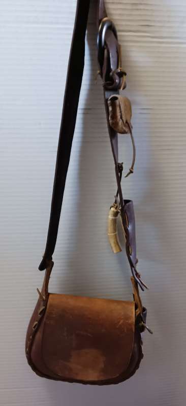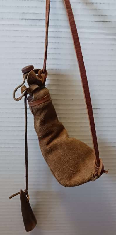 CVA shotbag with horn measure. All leather wooden pour spout and stopper. $20.00+ shipping