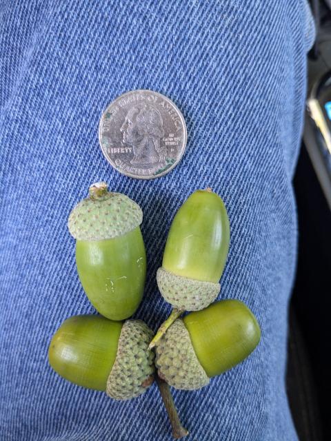 From my searching I believe they are white oak acorns.I stopped and picked up some leaves and took a picture of them. [Linked Image]
