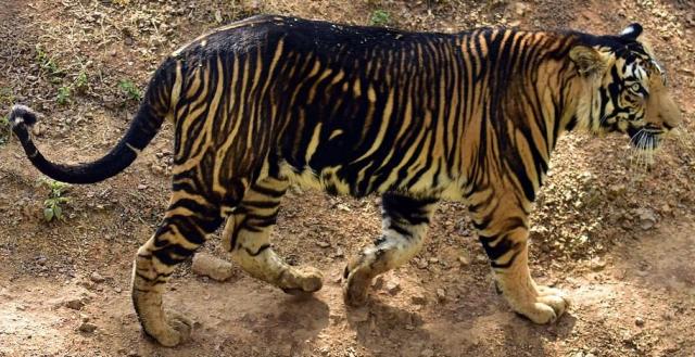 A magnificent, rare Black Tiger. More than 60 % of the reserve's tigers are black. Nowhere else on earth are these pseudo-melanistic Bengal tigers seen.